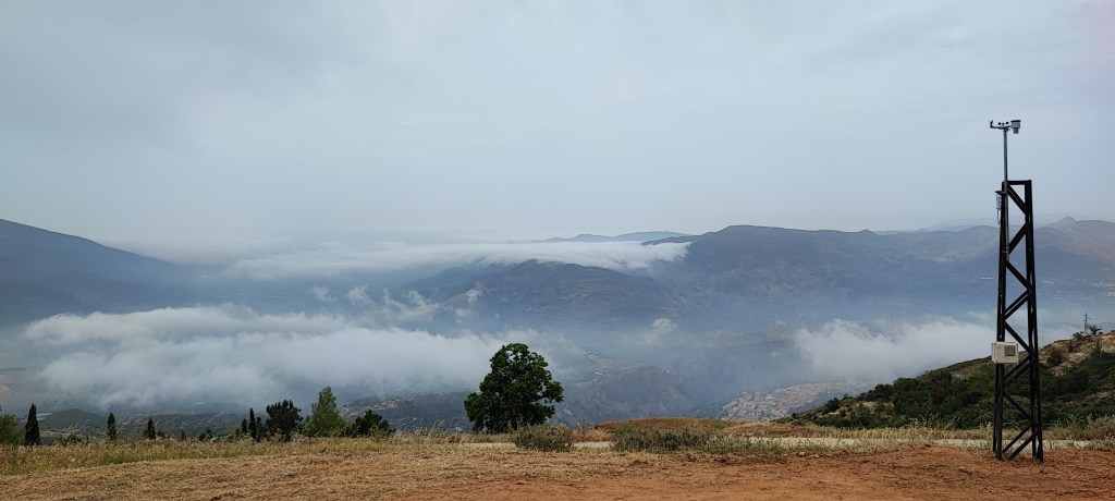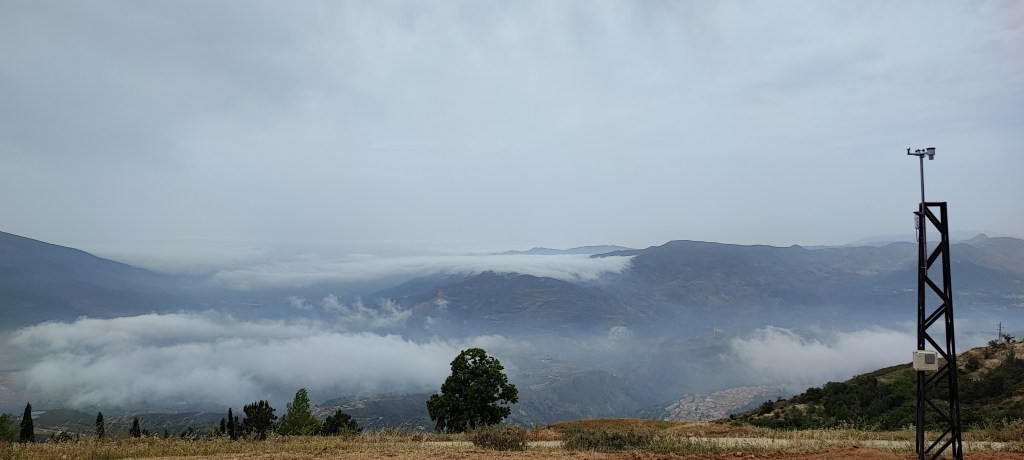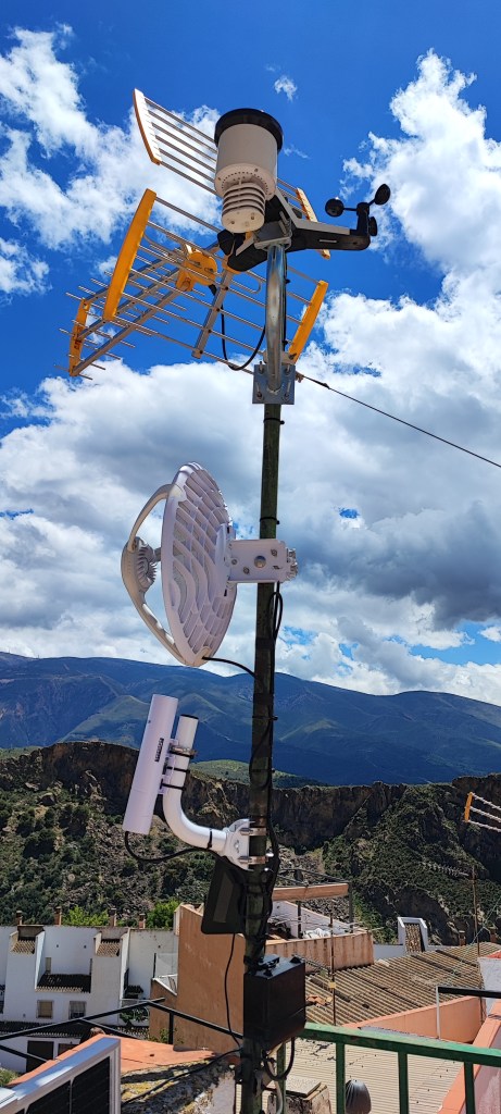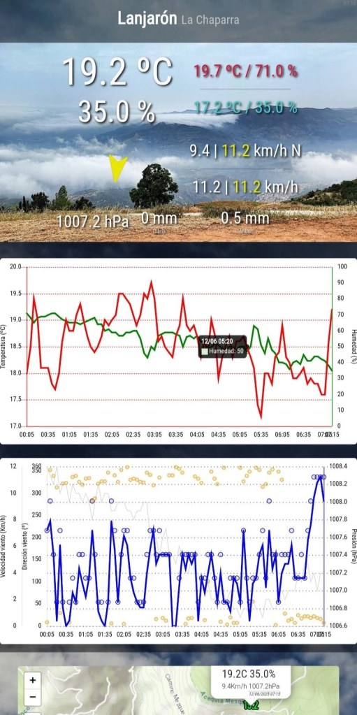 Ya tenemos operativa y subiendo datos desde hoy a mediodía la estación meteorológica de la Chaparra-Haza de Velica. Ésta estación meteorológica ha supuesto todo un reto técnico y logístico al tener que montar un sistema eléctrico fotovoltaico, hacer un radioenlace punto a punto para llevar internet, hacer una torreta y subirla a 1250 metros de altitud… Desde aquí dar las gracias al herrero que nos ha hecho la torre y a excavaciones Galdeano que con su mini excavadora nos hizo el hoyo para poner la torreta. Hoy, en el día del estreno de esta estación, MeteoLanjarón cumple dos años en un día en el que las nieblas de advección nos llegan desde el Mar de Alborán. Podéis visitarla en el siguiente enlace, recordaros que para cambiar de farenheit a centígrados, arriba a la derecha en setttings.